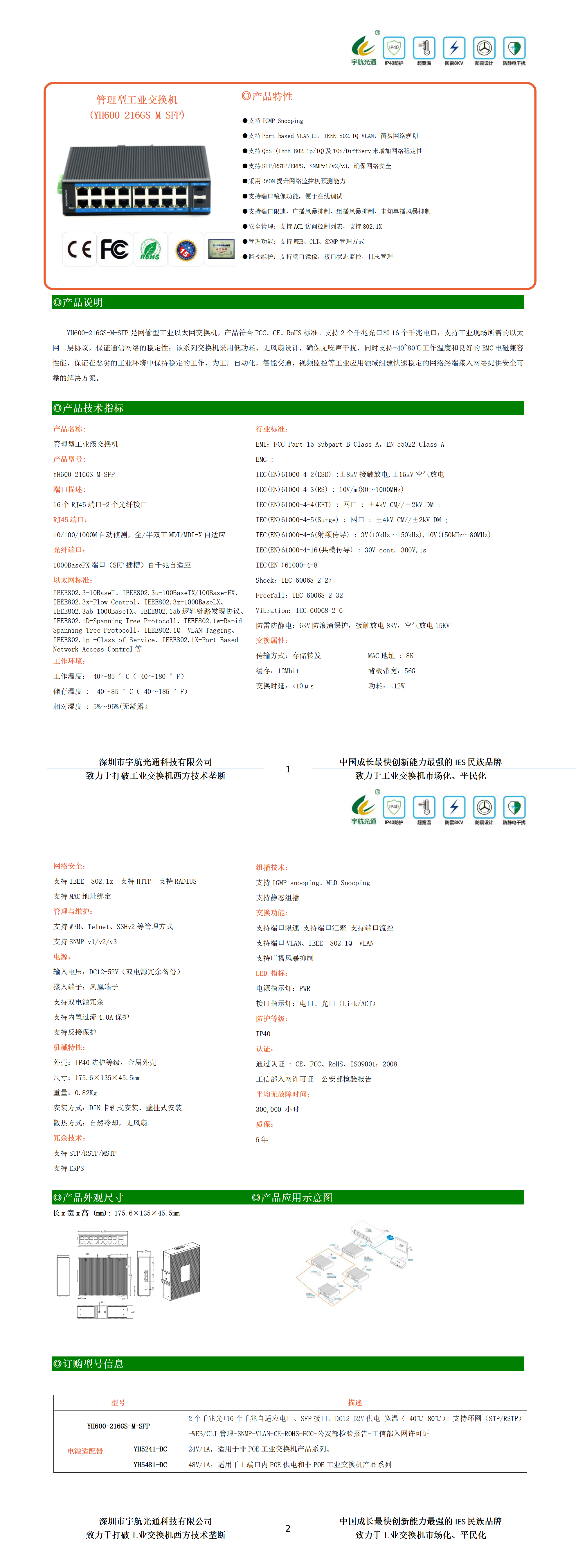 YH600-216GS-M-SFP是網(wǎng)管型工業(yè)以太網(wǎng)交換機(jī),產(chǎn)品符合FCC、CE、RoHS標(biāo)準(zhǔn)。支持2個(gè)千兆光口和16個(gè)千兆電口;支持工業(yè)現(xiàn)場所需的以太網(wǎng)二層協(xié)議,保證通信網(wǎng)絡(luò)的穩(wěn)定性;該系列交換機(jī)采用低功耗、無風(fēng)扇設(shè)計(jì),確保無噪聲干擾,同時(shí)支持-40~80℃工作溫度和良好的EMC電磁兼容性能,保證在惡劣的工業(yè)環(huán)境中保持穩(wěn)定的工作,為工廠自動(dòng)化,智能交通,視頻監(jiān)控等工業(yè)應(yīng)用領(lǐng)域組建快速穩(wěn)定的網(wǎng)絡(luò)終端接入網(wǎng)絡(luò)提供安全可靠的解決方案。