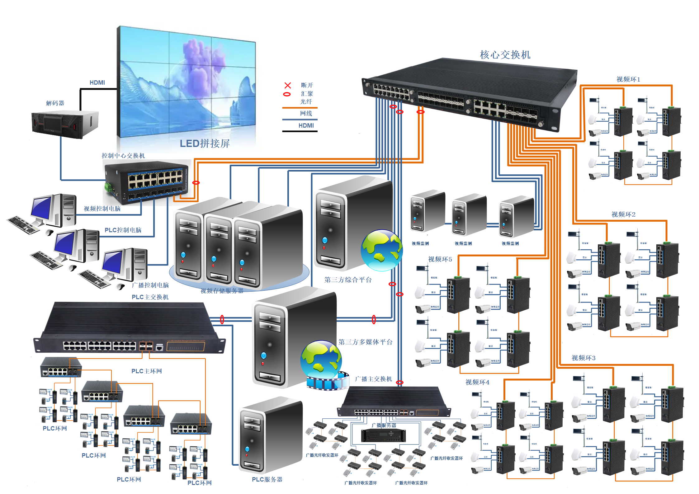整個(gè)方案通過HDMI視頻傳輸、光纖通信和以太網(wǎng)相結(jié)合的方式,實(shí)現(xiàn)視頻監(jiān)控、工業(yè)控制、廣播通信等多系統(tǒng)的統(tǒng)一接入和集中管理。